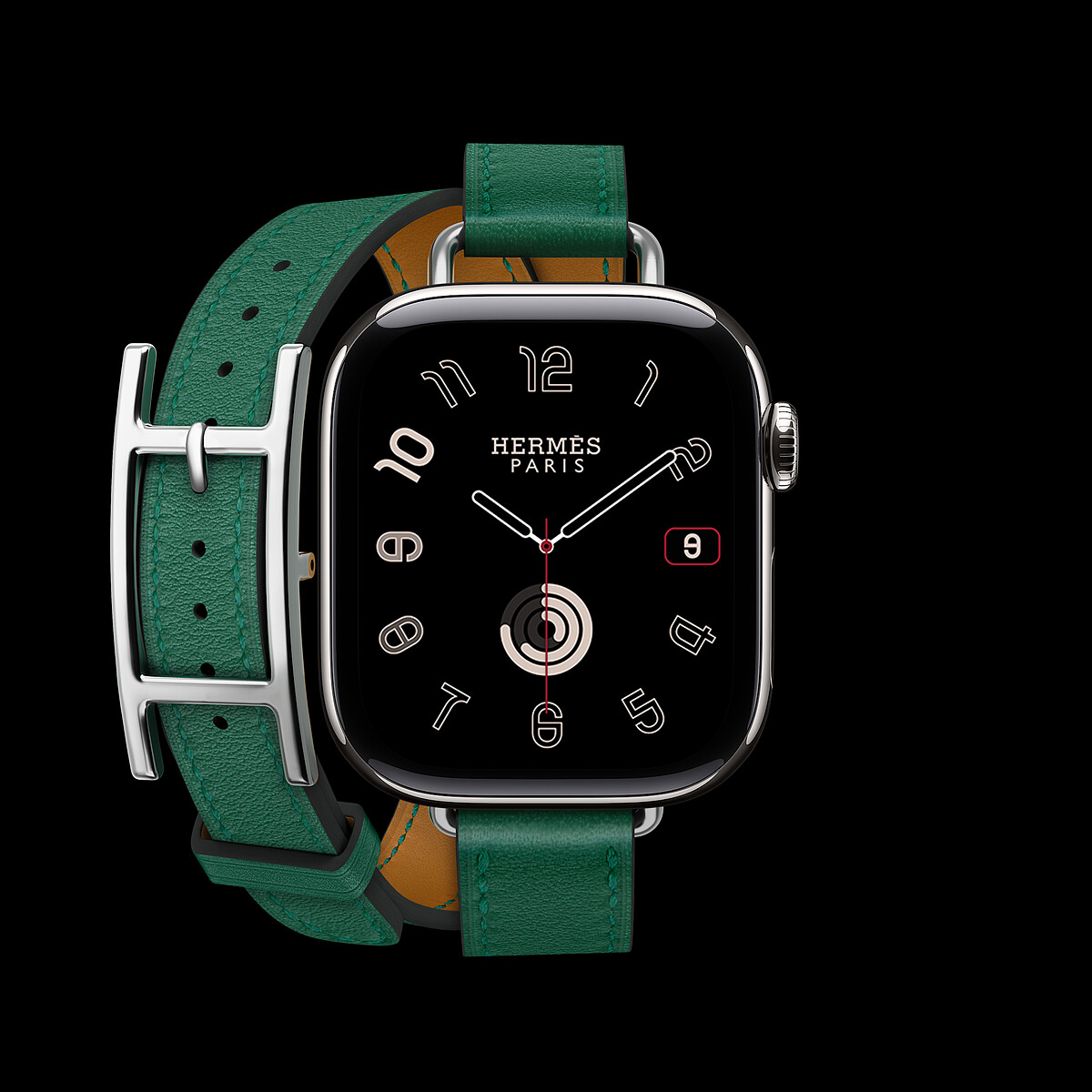 Apple Watch Hermes Series 10, 42 mm case in titanium, Swift calfskin Hapi Attelage double tour band in Vert Moyen color_NT$ 52,500