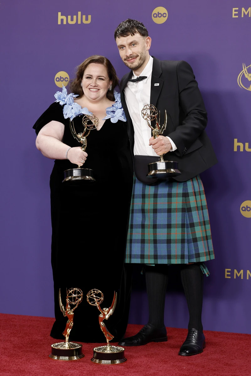 在台灣話題度很高的《馴鹿寶貝》,「唐尼」和「瑪莎」各抱回了最佳迷你影集或電視電影男主角、最佳迷你影集或電視電影女配角大獎。Richard Gadd當晚穿著西裝造型搭配蘇格蘭裙,腰間配以半月包,是男星之中相當具有特色的選擇;Jessica Gunning則是選擇V領黑色禮服,領口綴上藍色立體花朵,你覺得這回兩個人有般配嗎?