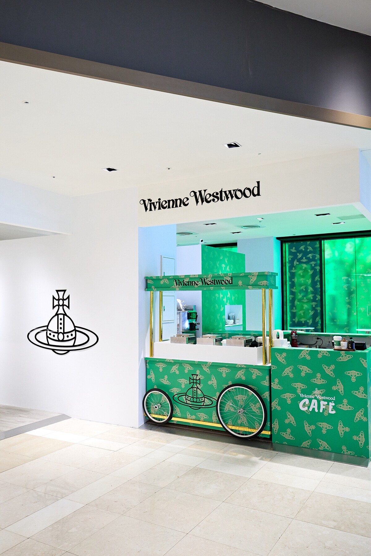 Vivienne Westwood A8快閃店以幸運草綠和黃色土星圖案為主題,大舉覆蓋整個店裝,店中展示了新款的飾品、2024秋冬浪漫印花系列的服裝單品、一整面的包包牆以及小皮件櫃。
