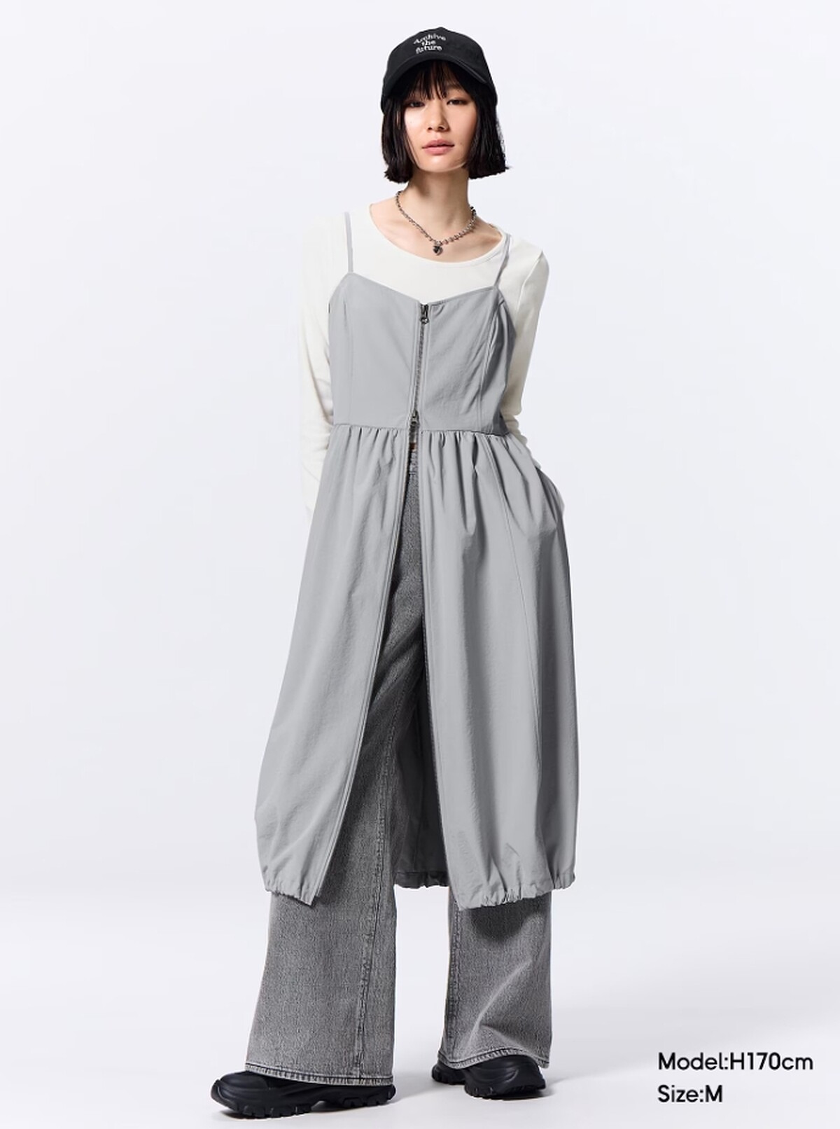 這件泡泡連身裙除了可作為洋裝穿著,前方拉鍊調整拉開後,也能當作層次感罩衫使用,打造時下最流行的裙+褲造型。