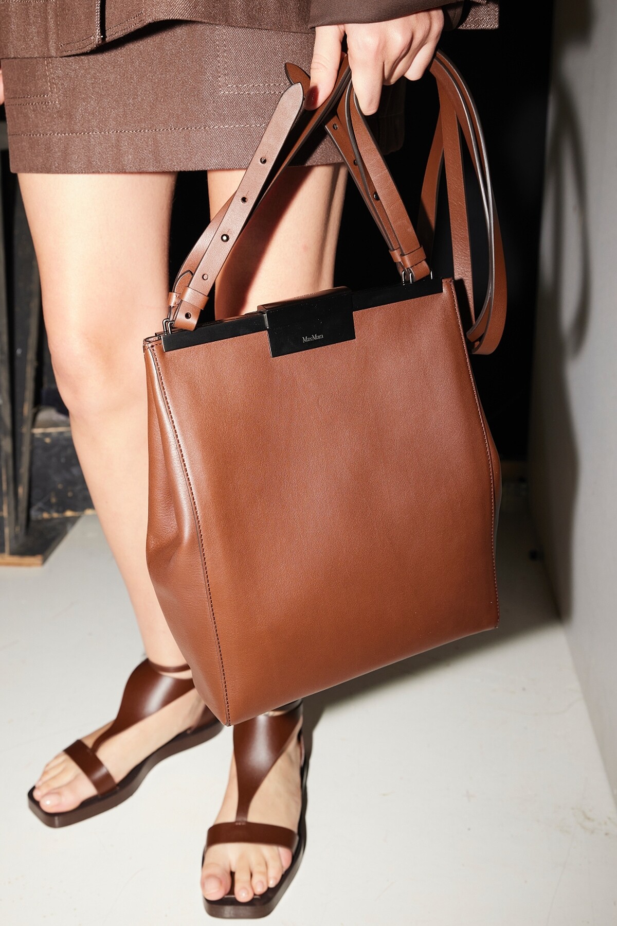 本篇強調了Max Mara在本季一系列結合與數學、幾何的概念,在包袋系列上也能看到,在看似扁平的包型上透過皮革的皺褶交疊,呈現立體感的手袋結構,在俐落中看見繁複工法。
