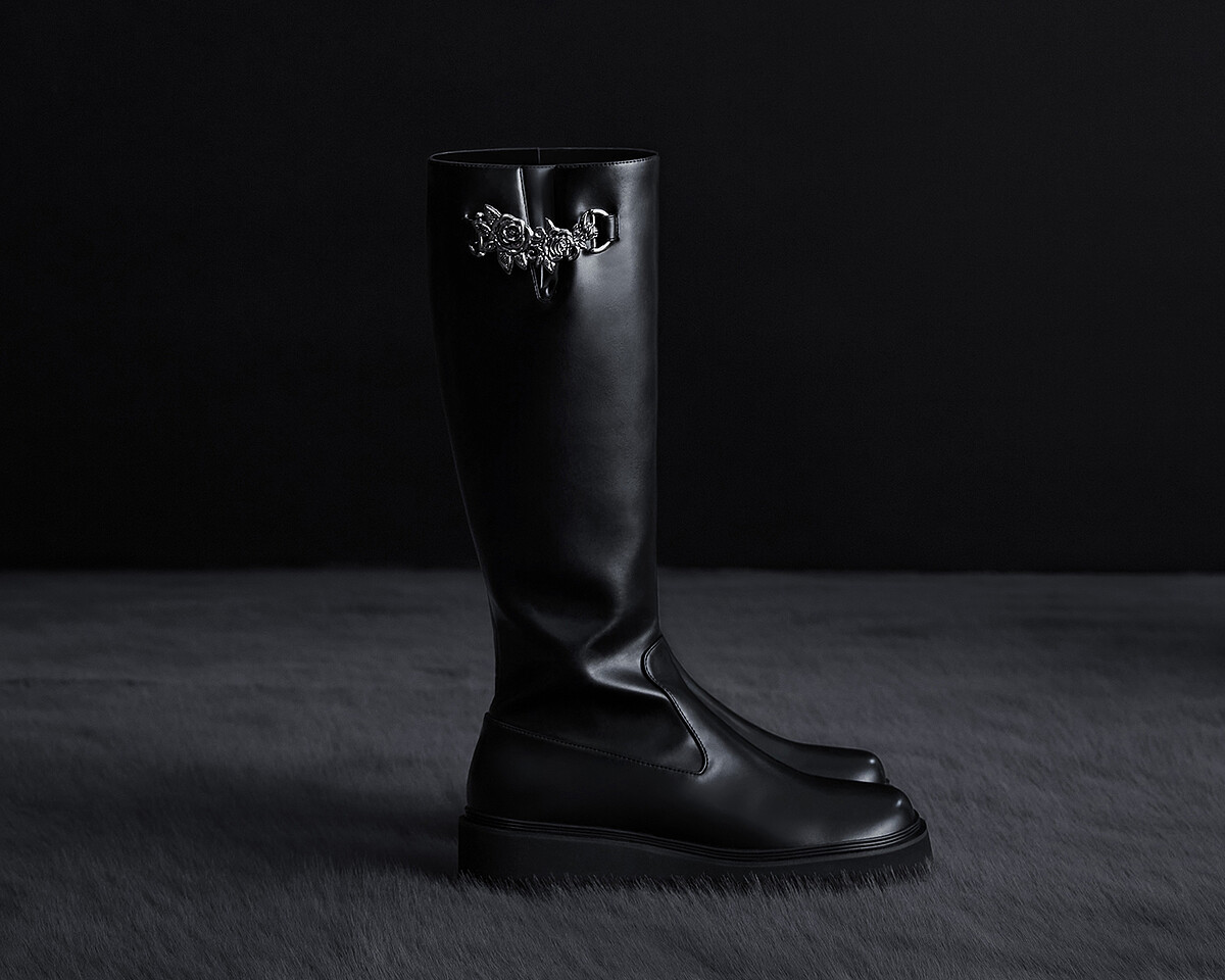 秋冬季必備的長靴也給囊括在這次的聯名系列中了!鞋款上,設計加入了金屬元素,側邊的扣環呈現玫瑰的雕刻圖案,顯現一股歌德暗黑的風格,簡約的版型容易與各種造型搭配。
