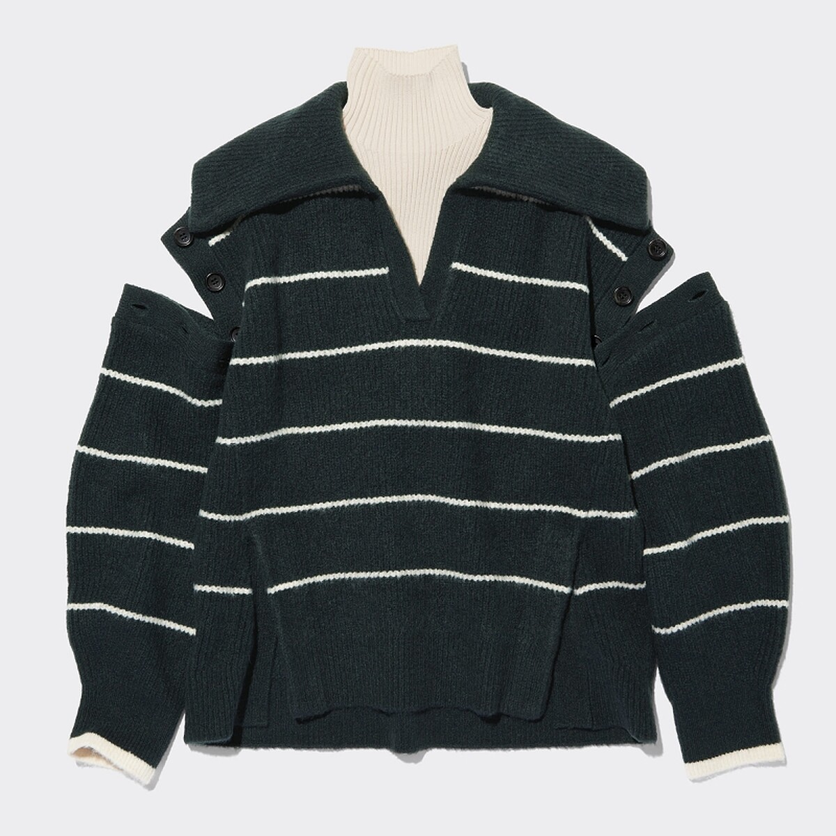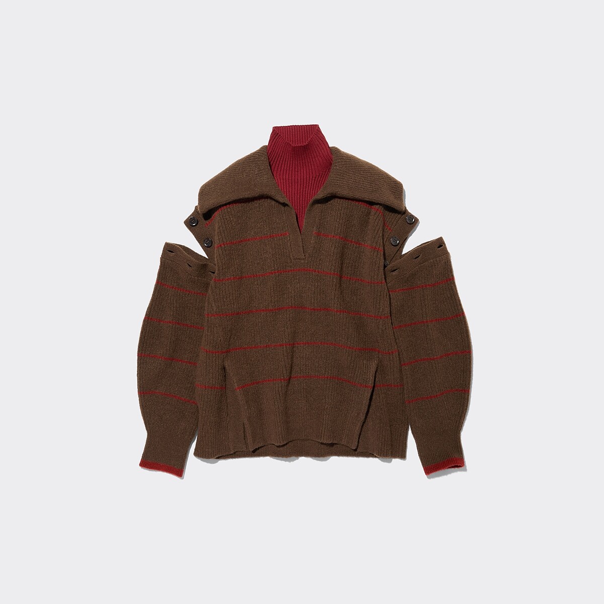 肩部鏤空搭配兩件式水手高領內搭的針織上衣,可以拆開搭配也可以疊搭穿著,展現色系層次感。