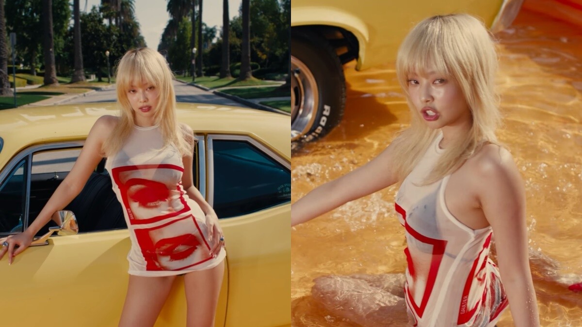 接著在黃色充氣泳池中,Jennie搖身一變化為金髮女郎,身穿Jean Paul Gaultier的透膚短洋裝、Jacquemus高跟鞋,透出內搭胸衣營造性感,再搭配上一輛1972 年的雪弗蘭Chevrolet Nova,將復古美式氛圍推到最高!