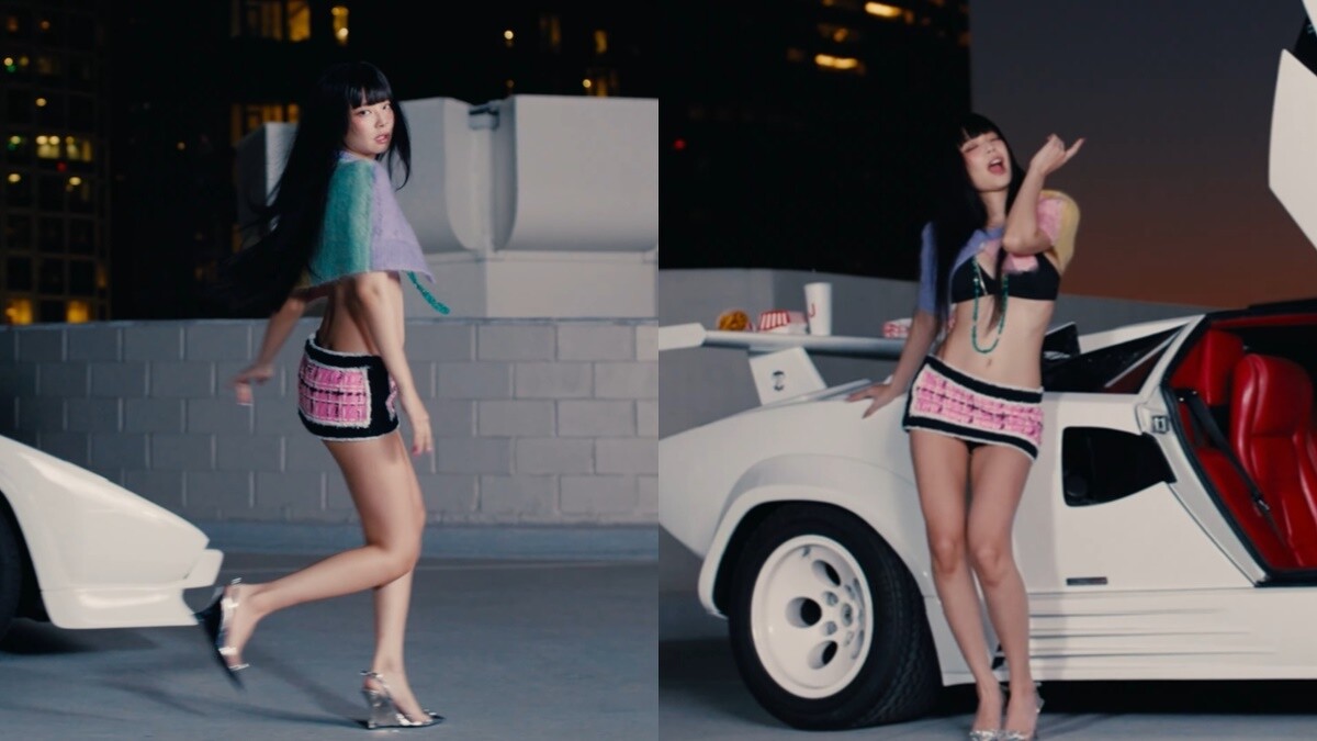 這套造型非常的歐美!Jennie選擇配色俏皮亮眼的披肩外套和迷你短裙,皆是來自Dsquared2的設計,搭配Versace的銀色高跟鞋,以及Chanel的長項鍊點綴,在1984年的Lamborghini 藍寶堅尼跑車與頂樓夜景的豪華場景裡,Jennie成為了一名千金名媛!