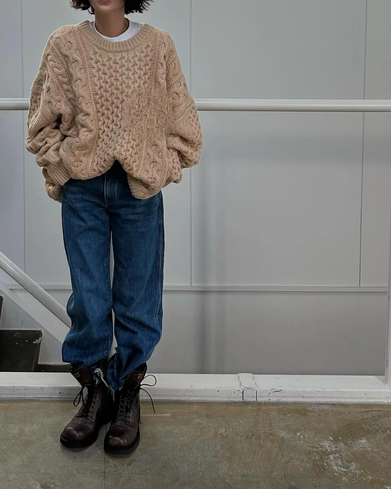 這套穿搭充滿休閒感,米色的針織毛衣展現了溫柔氣質,搭配卡其色寬鬆褲讓整體造型看起來更加舒適自在。小白鞋為整體增添了輕快感,適合秋冬的日常穿搭。