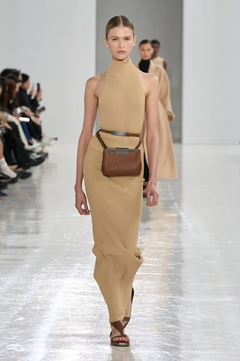 利用細腰帶來強調腰線,使駝色長洋裝不會顯得過於寬鬆,呈現出修長的身形,皮革涼鞋為這套造型增添了清新感,是初秋理想的搭配。