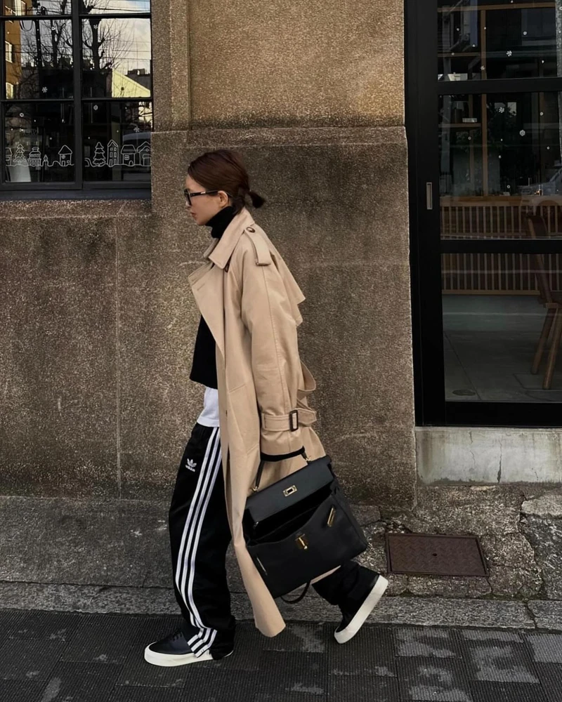 秋冬的穿搭離不開大衣,卡其色風衣搭配黑色系的運動服裝單品,讓整體造型看起來既休閒又時尚,選擇俐落大包與大衣呼應,讓穿搭增添都會感。