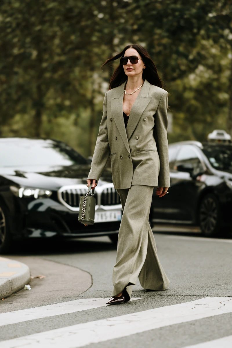 橄欖綠套裝在秋季穿搭中顯得沉穩大氣,內裡可選擇黑白色系搭配增添輕快感,同色系手提包為穿搭加入統一感。