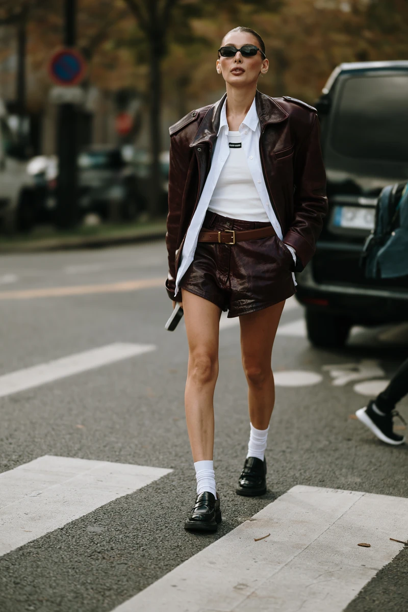 紅棕色皮衣外套展現出帥氣感,內裡疊搭淺色系襯衫與T恤駝色增添柔和的平衡,搭配上同色系的皮革短褲使腿部線條更顯修長,是適合秋冬的帥氣街頭風格。