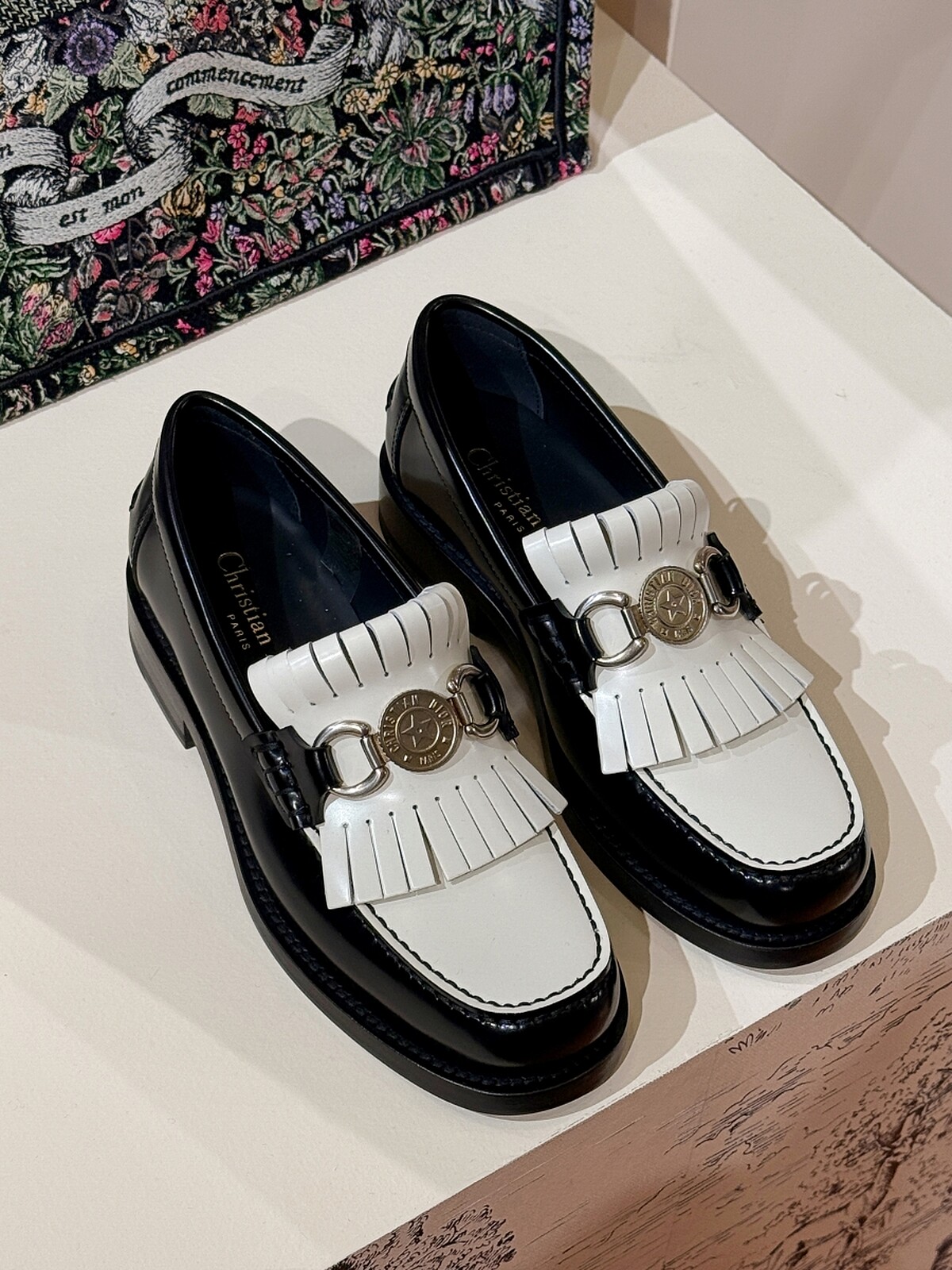 黑色小牛皮革打造的鞋身,搭配上白色皮革流蘇展現撞色的層次感,流蘇上設計以銀色幸運星金屬圓牌點綴。