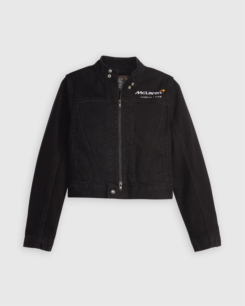 本次聯名推出的女性丹寧夾克外套非常好看,版型致敬經典賽車外套,左胸前印有麥拉倫車隊的品牌標誌,以防風暗扣喉鎖片與腰帶暗扣,配置可以雙向拉的拉鍊,將近期時尚圈火紅的賽車外套風格融入丹寧面料。