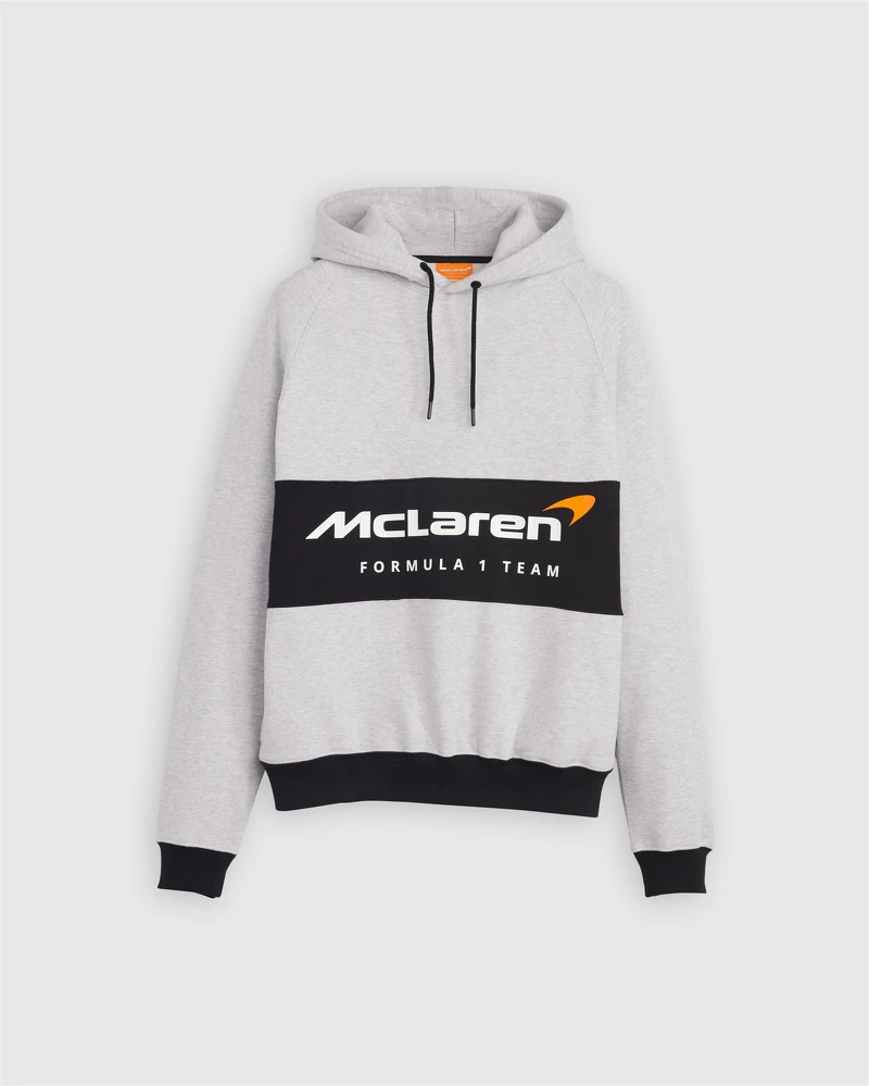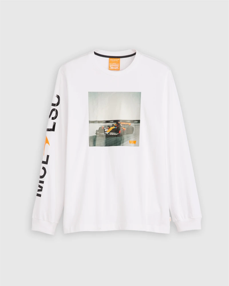 長袖款T恤印有麥拉倫F1賽車的照片印花,凸顯出聯名主打的速度感,側邊衣袖使用亮面矽膠印刷技術印上醒目的Logo。
