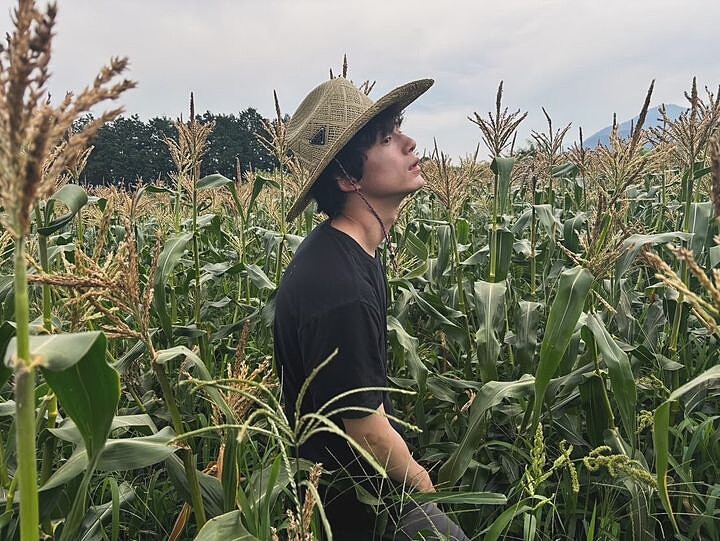 私下的坂口健太郎偏好素色的服裝,走的是低調、不爭不搶的路線,而這也是打造清新鹽系穿搭的要點之一。在一片玉米田中,坂口健太郎僅以一件黑色T恤與草帽,來完成他的鄉村風造型。