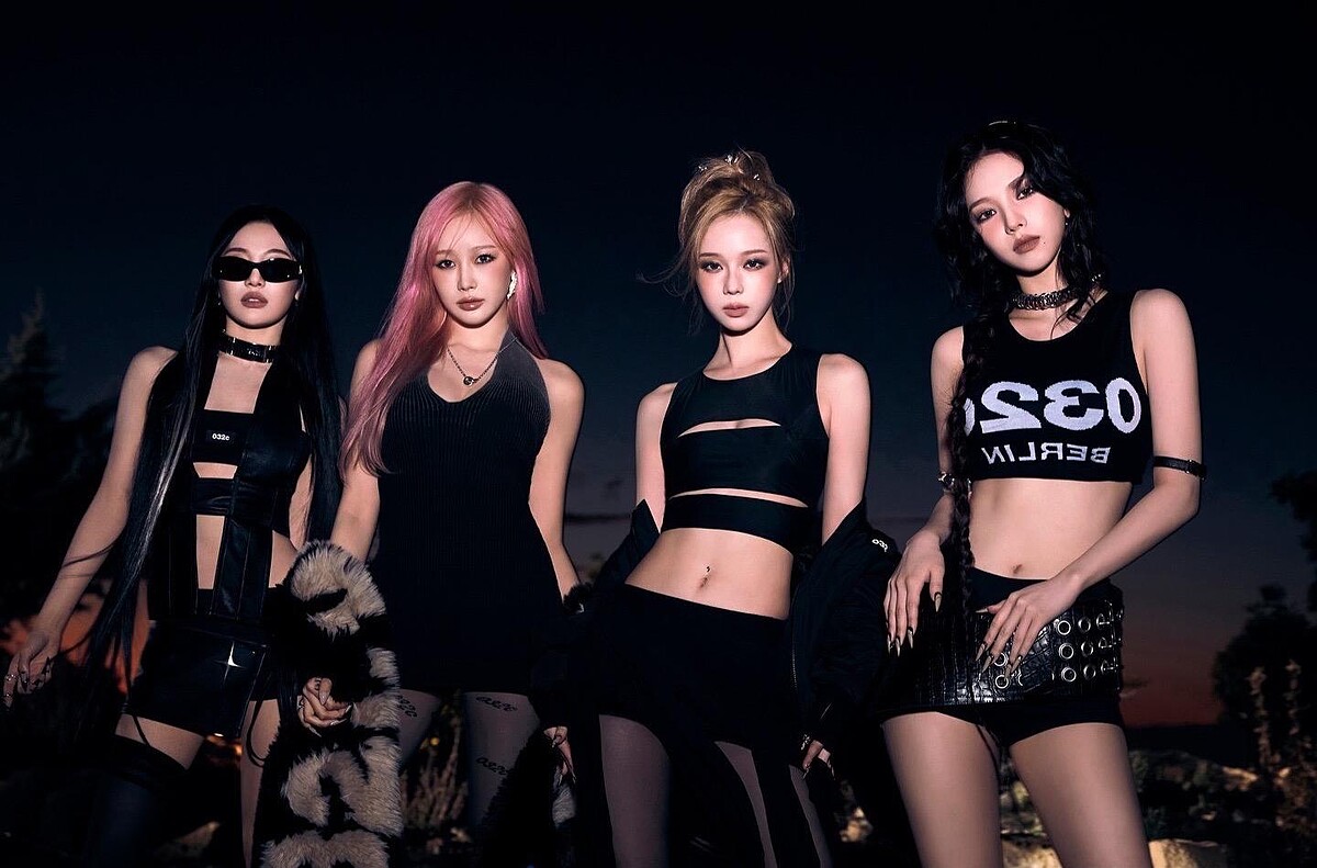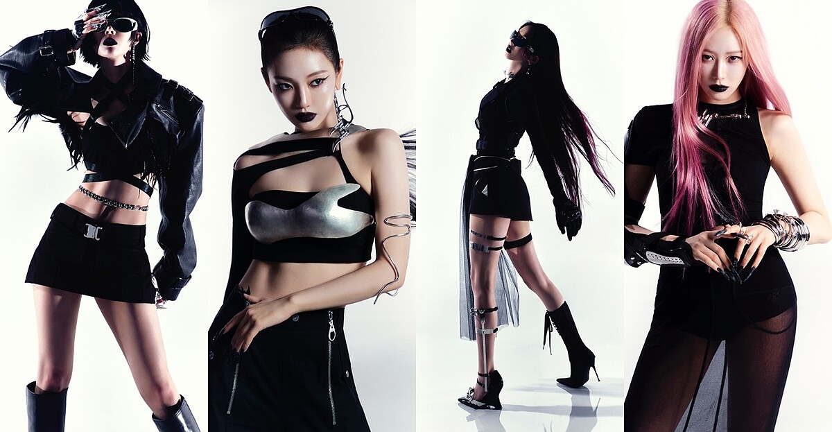 這套「Y3K機械妖姬」造型釋出後即形成超高討論度,四位成員的造型以黑、銀配色為基礎,並在不對稱的誇張剪裁裡加入了金屬零件,像是腿部的支架、腰鍊、份量感手鐲與首飾,讓她們與預告中率先釋出的AI角色幾乎如出一轍!