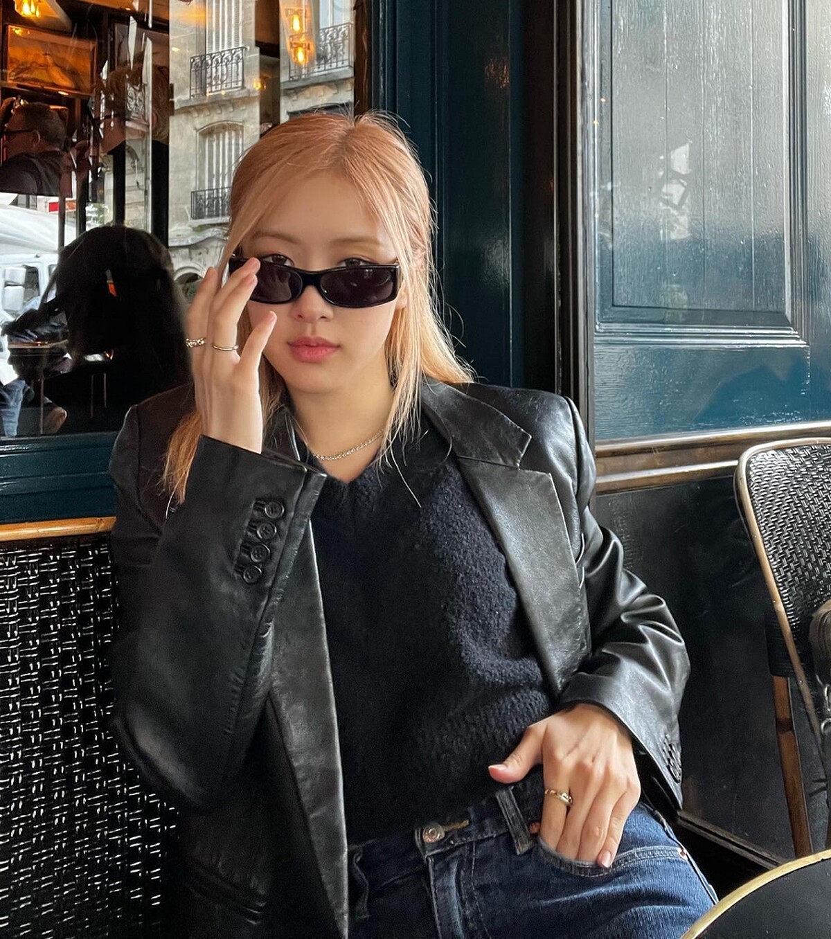 Rosé的皮衣造型非常多元,其中這件皮衣西裝外套搭配上黑色針織衫與牛仔褲,雖然簡約又不失個性,休閒或上班都很適合。