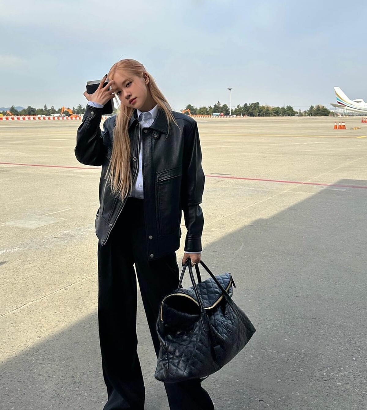 Rosé一直都是以簡約時髦的風格為人熟悉,這件頗有商務感的襯衫領黑色皮衣內搭襯衫影造層次感,下身是寬鬆的黑色長褲,營造出舒適但不失格調的機場穿搭。