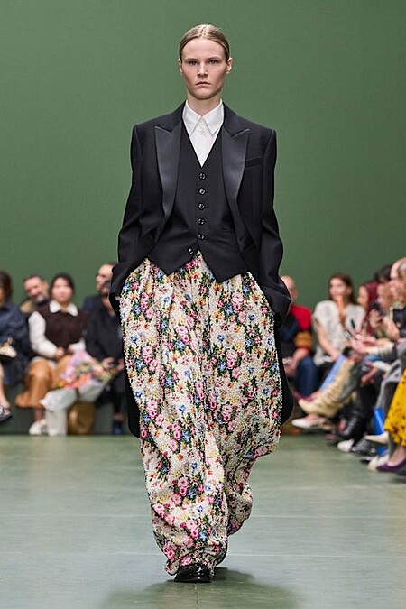 在 2024 秋冬大秀上,Loewe 也以中性風格強烈的燕尾服結合印花寬鬆長褲,讓人聯想到到關於一場宮廷晚宴般的奢華與神秘。