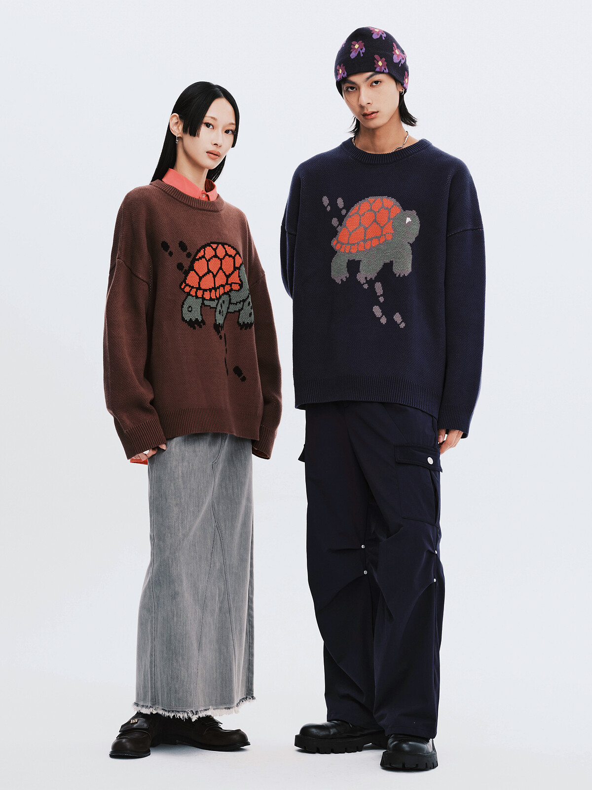 烏龜圖案象徵PLATEAU STUDIO「龜兔賽跑,一步一腳印」的品牌精神,卡通感的呈現特別可愛,毛衣的質料是非常厚實綿密的手感,柔軟但是又具有挺度,這回一次推出了4個顏色,包括灰色、棕色、深藍與葡萄紫色,全是秋冬季節衣櫃必備的百搭色調。
