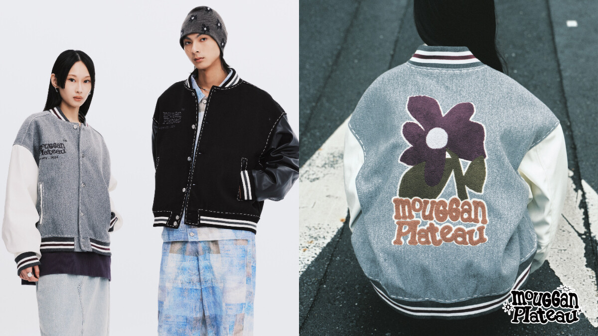 棒球外套是mouggan少見的帥氣單品,以中性的棒球外套版型,將撞色元素加入縫線以及衣領、袖口和下襬的鬆緊羅紋,背面則是幾何花朵與雙方聯名Logo的毛圈刺繡,在帥氣之中注入了俏皮感,是本次聯名系列中最具識別度的一款。