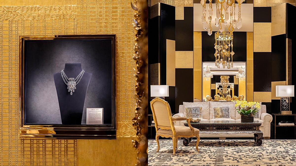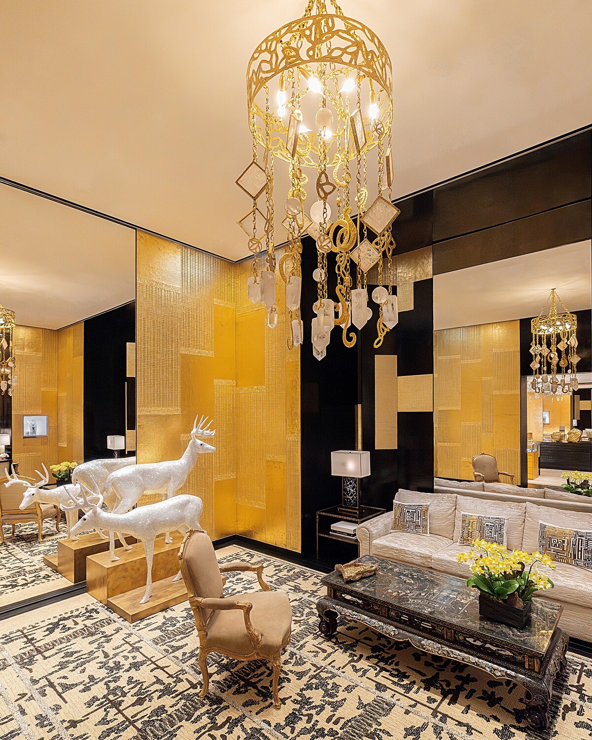 一系列精采的藏品重點包括,VIP包廂(設有拉門能獨立空間,與巴黎創意工坊無時差連線、客訂作品設計!),沙發背後牆面,委託伊朗裔美國畫家 Y.Z. Kami 創作裝飾的訂製多聯拼貼作品;另一側,法國攝政時期風格的長桌後方鏡牆上,訂製鑿刻青銅古董鏡綴以白水晶與波西米亞水晶;美國藝術家Mark Swanson 的「Untitled (standing alert)」水晶鹿雕塑品,呼應香奈兒女士寓所內所收藏的一對鹿雕像;結合陶瓷、鏡面、漆包線、木框架及金色花朵綴飾的「Pride」 鏡子出自英國藝術家 Barnaby Bradford之手。