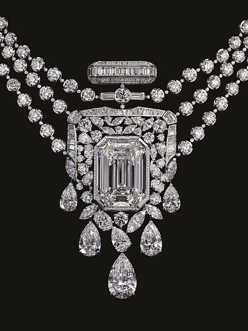 “700顆鑽石鑲嵌於55.55克拉訂製寶石周圍璀璨綻放。「這是前所未有的手法」香奈兒珠寶創意工作室總監Patrice Leguéreau說道。「我們從原石開始,並非是為了製作出最大顆的鑽石,而是要完美取得55.55克拉八角形鑽石」。以和諧的祖母綠形切割,完美呈現D色無瑕(D Flawless)及具標誌性重量的55.55克拉鑽石,18K白金外環圈鑲嵌104顆圓形鑽石及42顆長階梯形切割鑽石,體現香奈兒在創作及技術層面對完美及精確的堅持。”