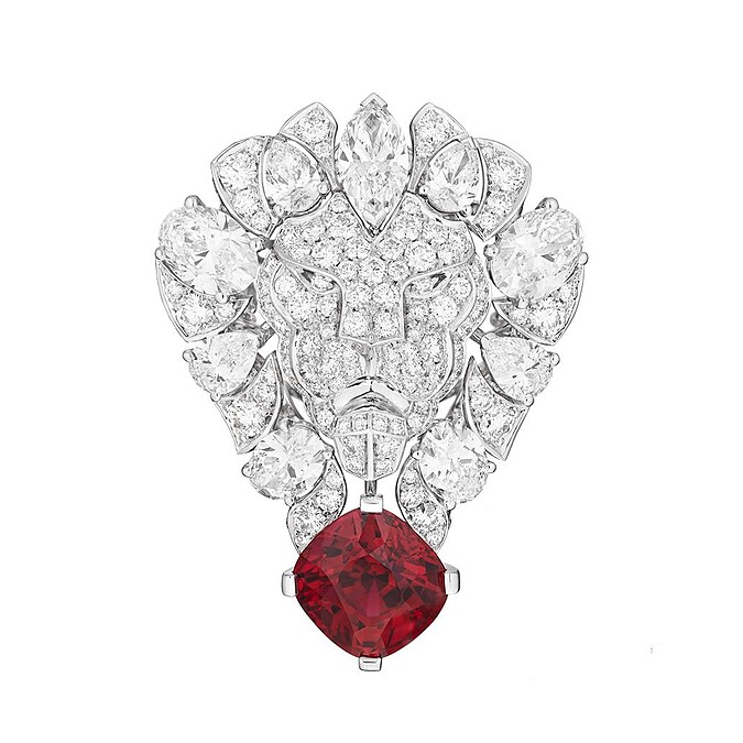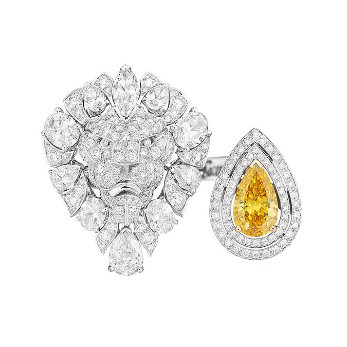 另外兩款獅子符碼的全新高級珠寶作品Legendary Lion戒指也相當吸睛。花式切割鑽石鋪鑲勾勒出充滿力量感的獅子鬃毛,一款鑲嵌4.02 克拉的枕形切割紅寶石,另一款鑲嵌1.72 克拉彩橘黃色梨形切割主鑽的款式,則以指間戒的型態呈現。