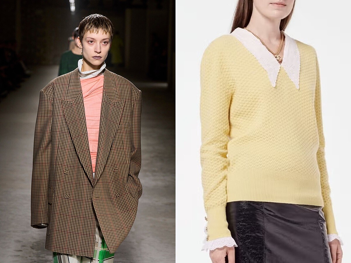 GD於〈POWER〉MV中穿著寬大尺寸的復古格紋西裝外套,出自Dries Van Noten 2024秋冬的設計,內搭鵝黃色毛衣搭配蕾絲細節,為Chanel於曼徹斯特發表的2023 Métiers d'art工坊系列單品,包括胸前的山茶花胸針也是來自Chanel。