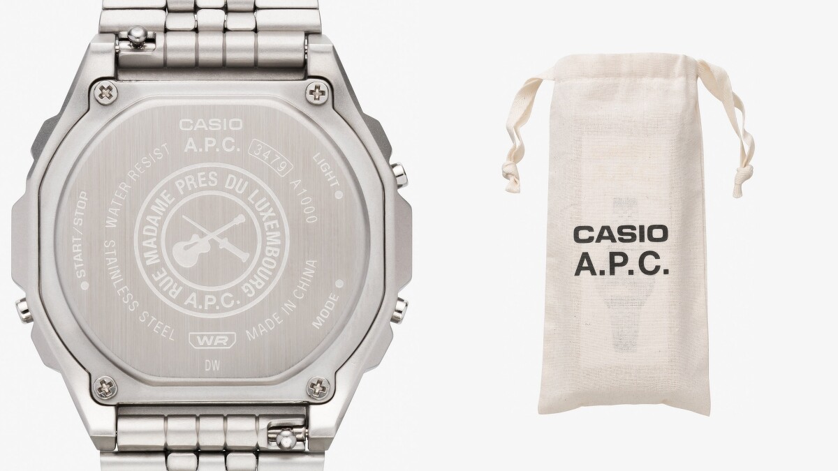 此次聯名錶款以CASIO經典的A1000為基礎,這款錶在過去也曾與紐約品牌rag & bone的合作中作為聯名款式,本次融入A.P.C.一貫簡練的設計元素,纖薄的外型搭配八角形錶殼,以及不鏽鋼金屬細格錶帶,展現出帶有1970年代的復古美學。