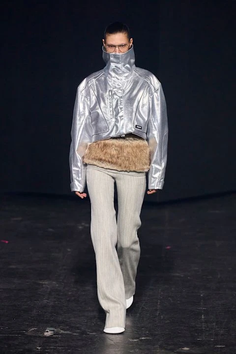 如何運用未來感單品穿出現代感都市造型?一件存在感十足的短版上外套與時髦眼鏡是個好選擇,總是走在時代尖端的 Coperni 在本季做了很好的示範。