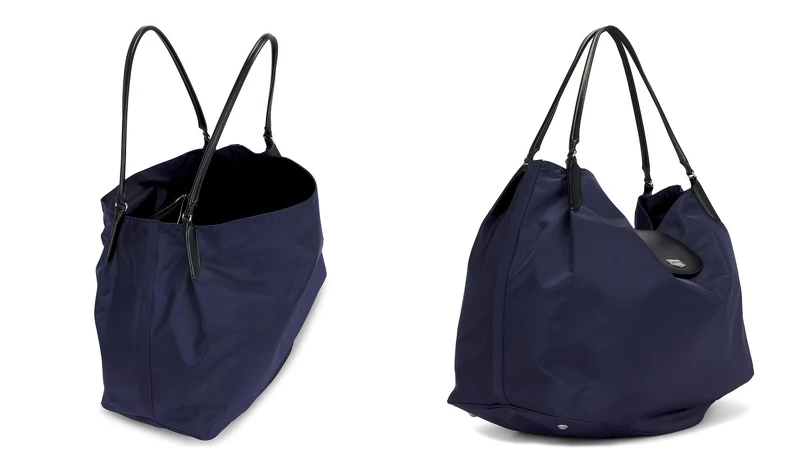 雖然這款大肩背包包身採用較為日常感的尼龍製作,但搭配的皮革的包蓋與肩背帶,銀色品牌金屬標在皮革包蓋上顯得低調。