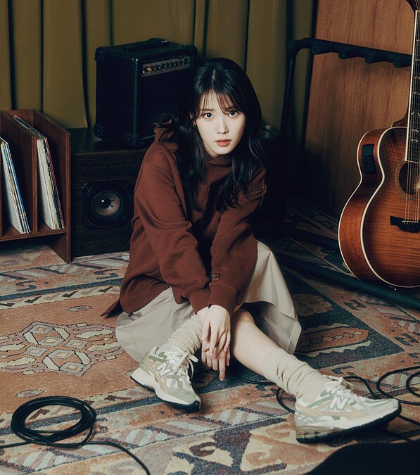 IU在畫報中穿著的1906R,雖然延續過去復古運動跑鞋的設計,但鞋身上以柔和的粉膚色與綠色麂皮交錯的線條感,以及細節處加入柔白色點綴,展現秋冬感的的同時,也能兼具時尚搭配度。