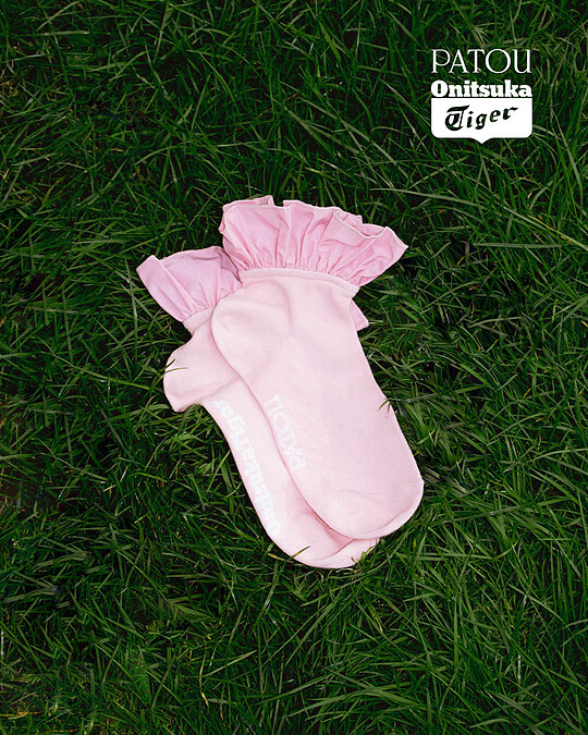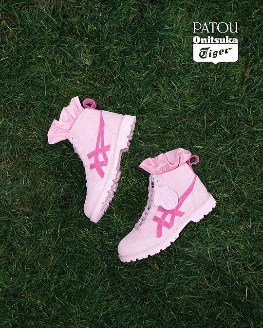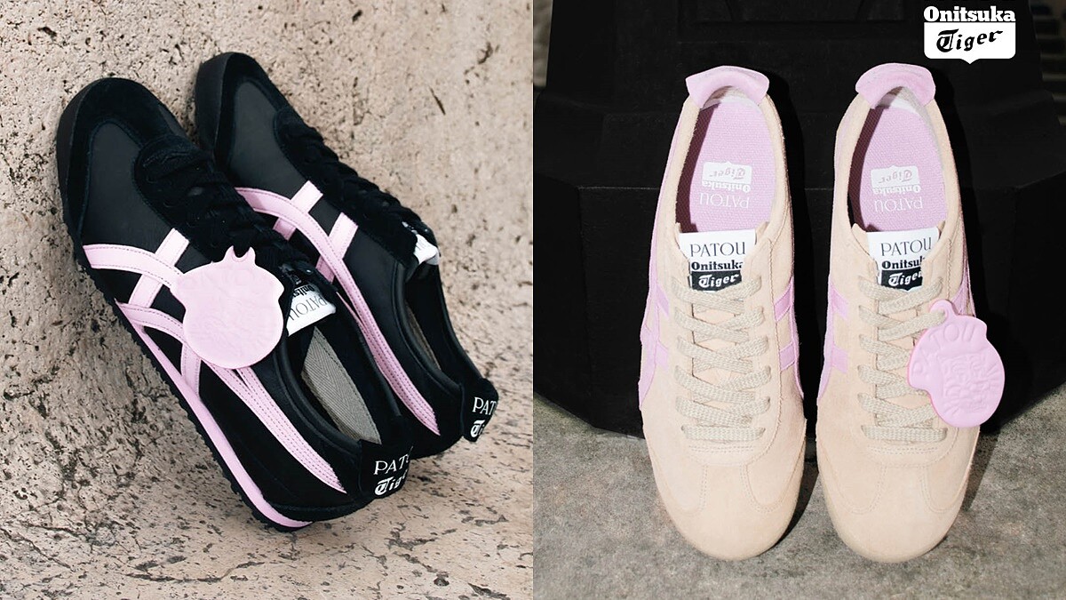 被Lisa一舉穿紅,明星與時尚博主們也各個人腳一雙的鬼塚虎Mexico 66復古薄底鞋,在與Patou的合作中煥然一新,鬼塚虎招牌的條紋Logo加入Patou的螺紋緞帶低調點綴,並以Patou獨特的粉色運用於4雙黑、白、粉、駝色的款式裡,虎頭標誌則化為可愛的鞋帶吊飾,兼具收藏價值與裝飾性。