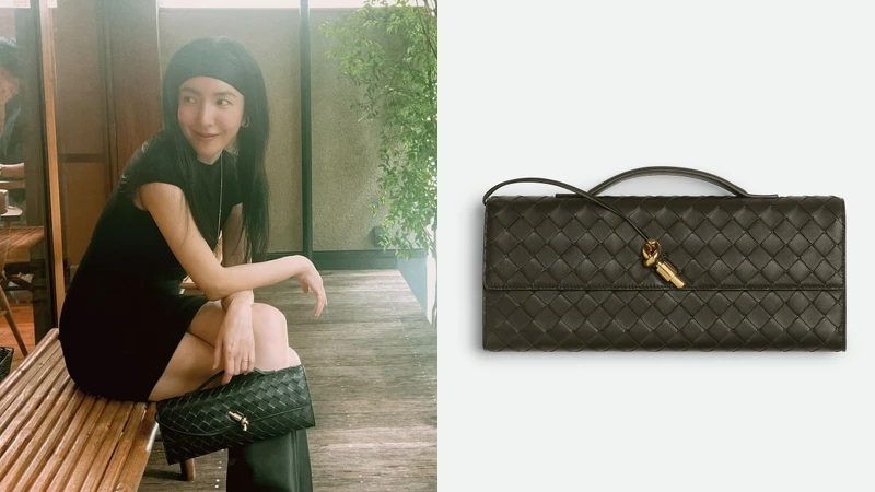 私服中楊謹華在夏天的出遊中以一身黑色短連身裙搭配上Bottega Veneta的Andiamo編織手拿包,包身上搭配提把並以黃銅金屬扭結扣開合包款,俐落又輕巧。