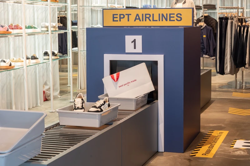 ept快閃店將店內打造成機場安檢的場景,作為台灣門市的專屬視覺,有機場航廈的各種指標,還有擬真的安檢輸送帶,感覺就像是一秒來到韓國,將韓式的沉浸式概念店裝移入,創造出限時的打卡地標!