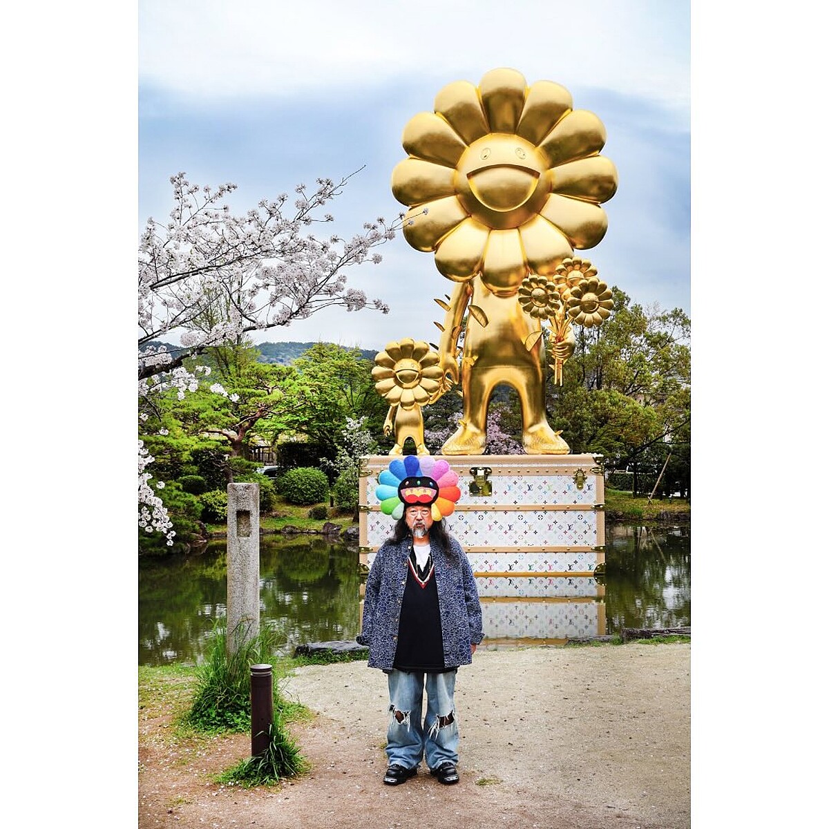 村上隆與路易威登的合作不止於包款配件,在2020年時,村上隆在全球新冠疫情期間打造了名為《Flower Parent and Child》的巨型金色雕像,而這座雕像在今年9月搭配著村上隆在2003年設計的繽紛Monogram行李箱一起在京都市京瓷美術館的日本花園中再度亮相!