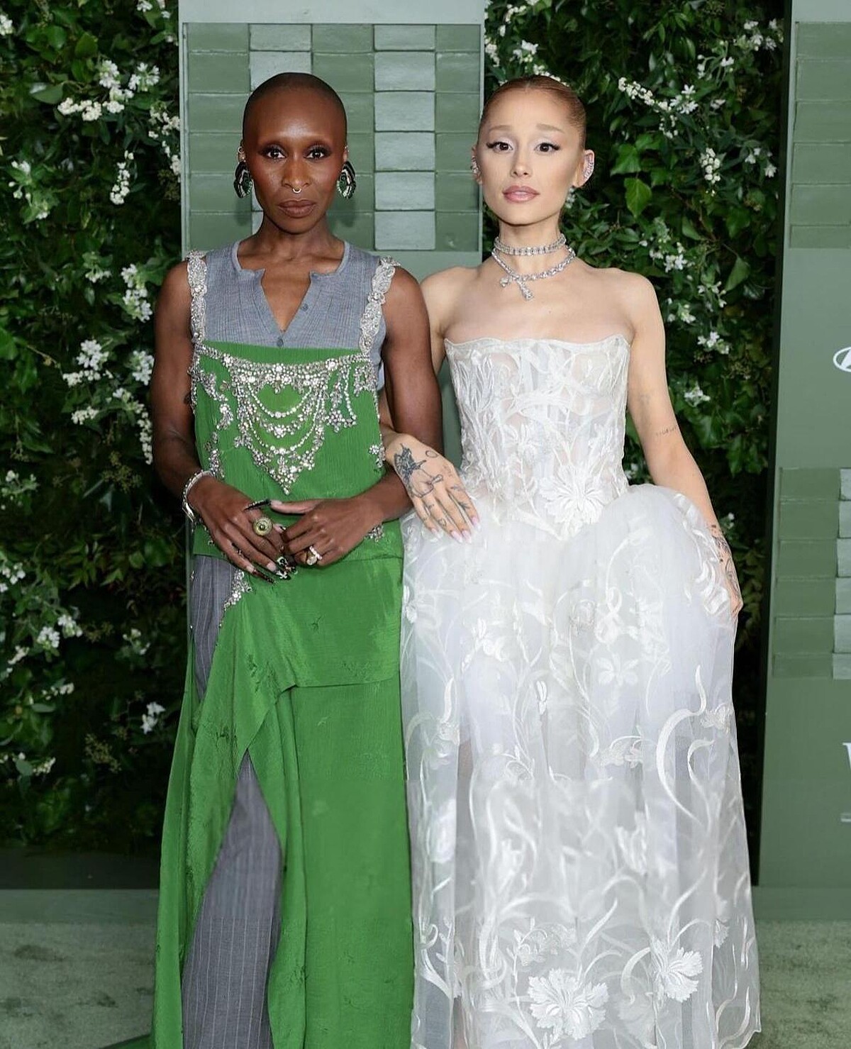 Ariana Grande、Cynthia Erivo一同出席華爾街日報創新者獎頒獎典禮,他們選擇了華麗正式的造型,Cynthia Erivo以Erdem 2025春夏的綠色背心裙再次呼應電影,Ariana Grande身上的純白婚紗,來自Vivienne Westwood 2024婚紗系列,心形的裙撐同時具有份量感又顯得空靈輕盈。