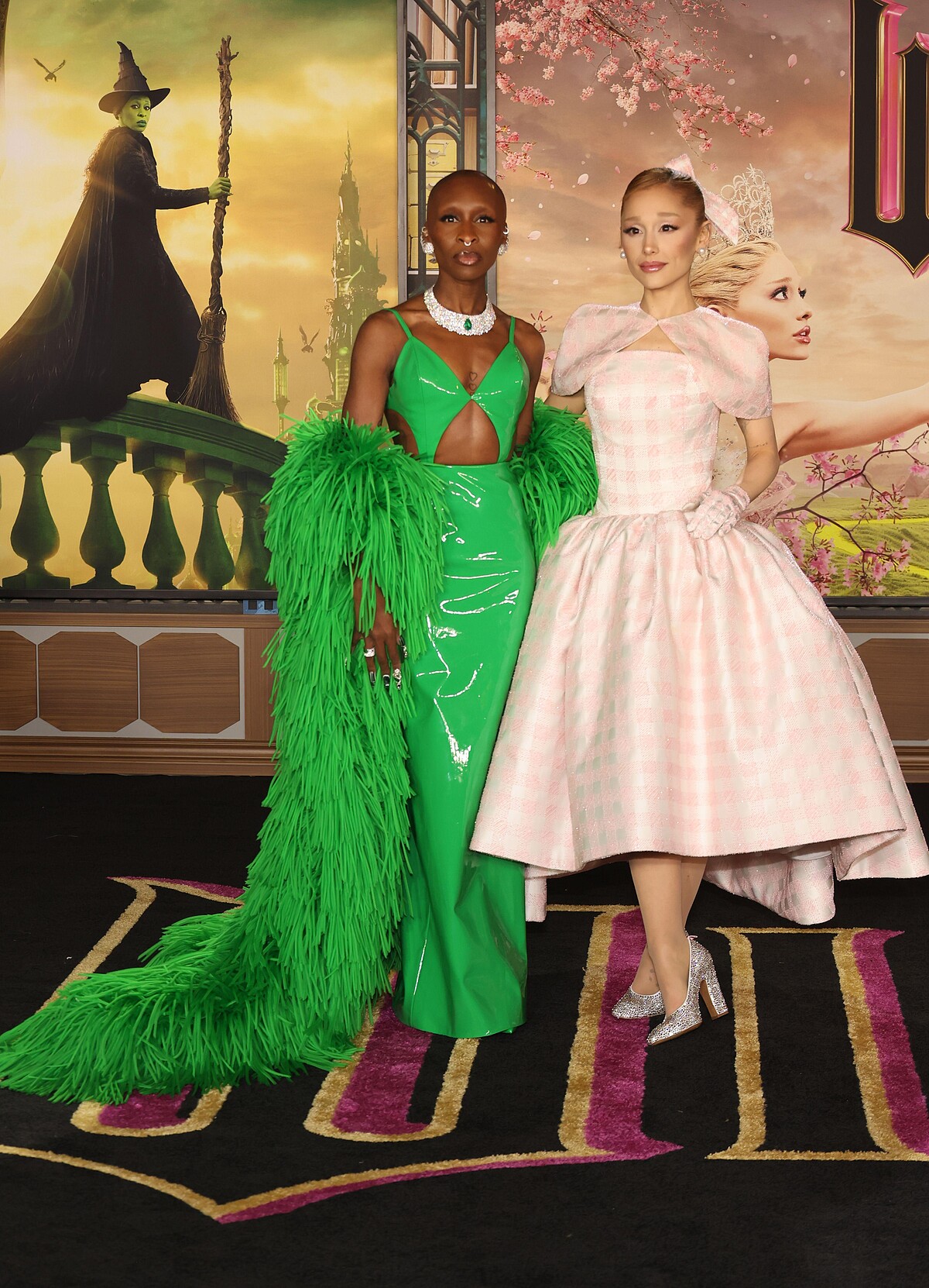 紐約首映會上兩位女主角帶來了優雅不失主題性的裝扮,Ariana Grande身穿 Louis Vuitton的粉色馬甲訂製服,花苞裙襬與長裙襬疊出層次,Cynthia Erivo的Dior黑色透視衫與網紗帽,帶來端莊典雅的風格。