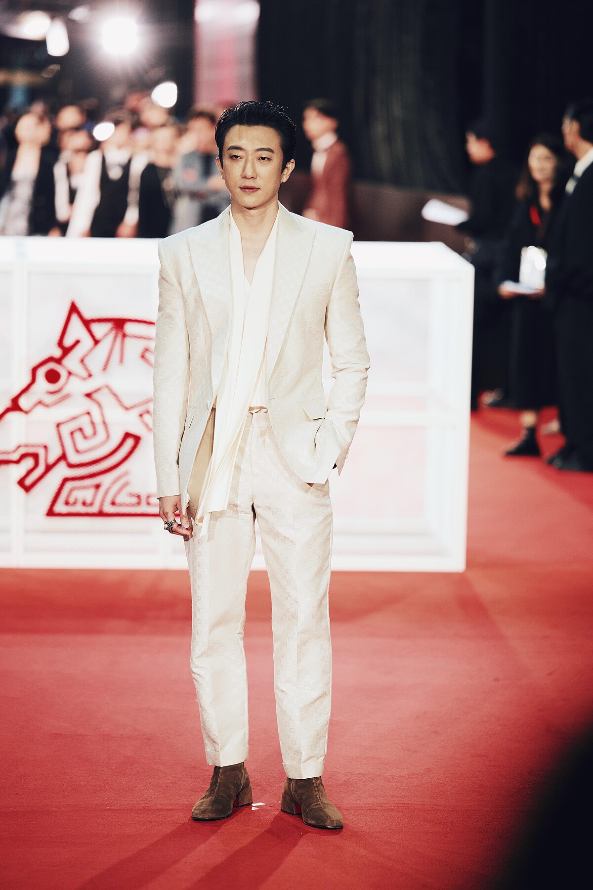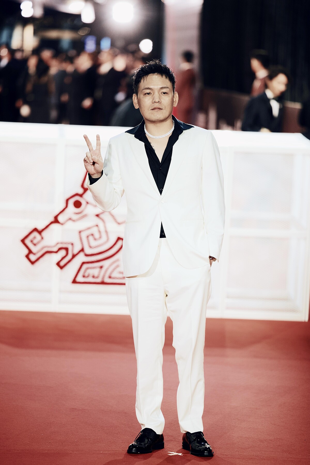 春風選用一身黑白西裝造型亮相本屆金馬獎,開領襯衫搭配白色西裝套裝,帶些率性不羈的造型很適合他。