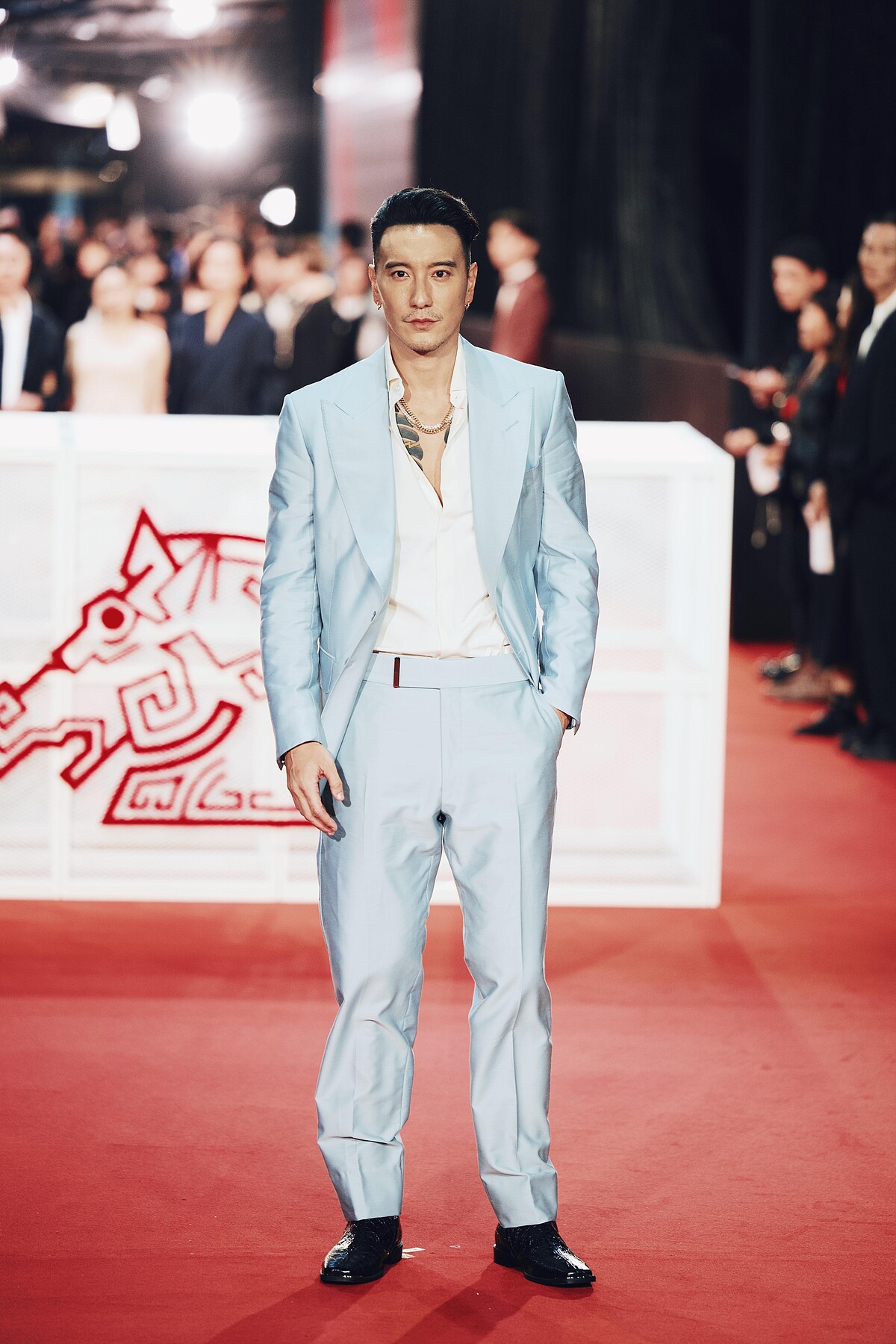 王陽明出席本屆金馬紅毯,以一身天空藍大劍領西裝外套搭配同色西裝褲作為造型主調,開領微露刺青的細節也帶出屬於他的性感男人魅力。