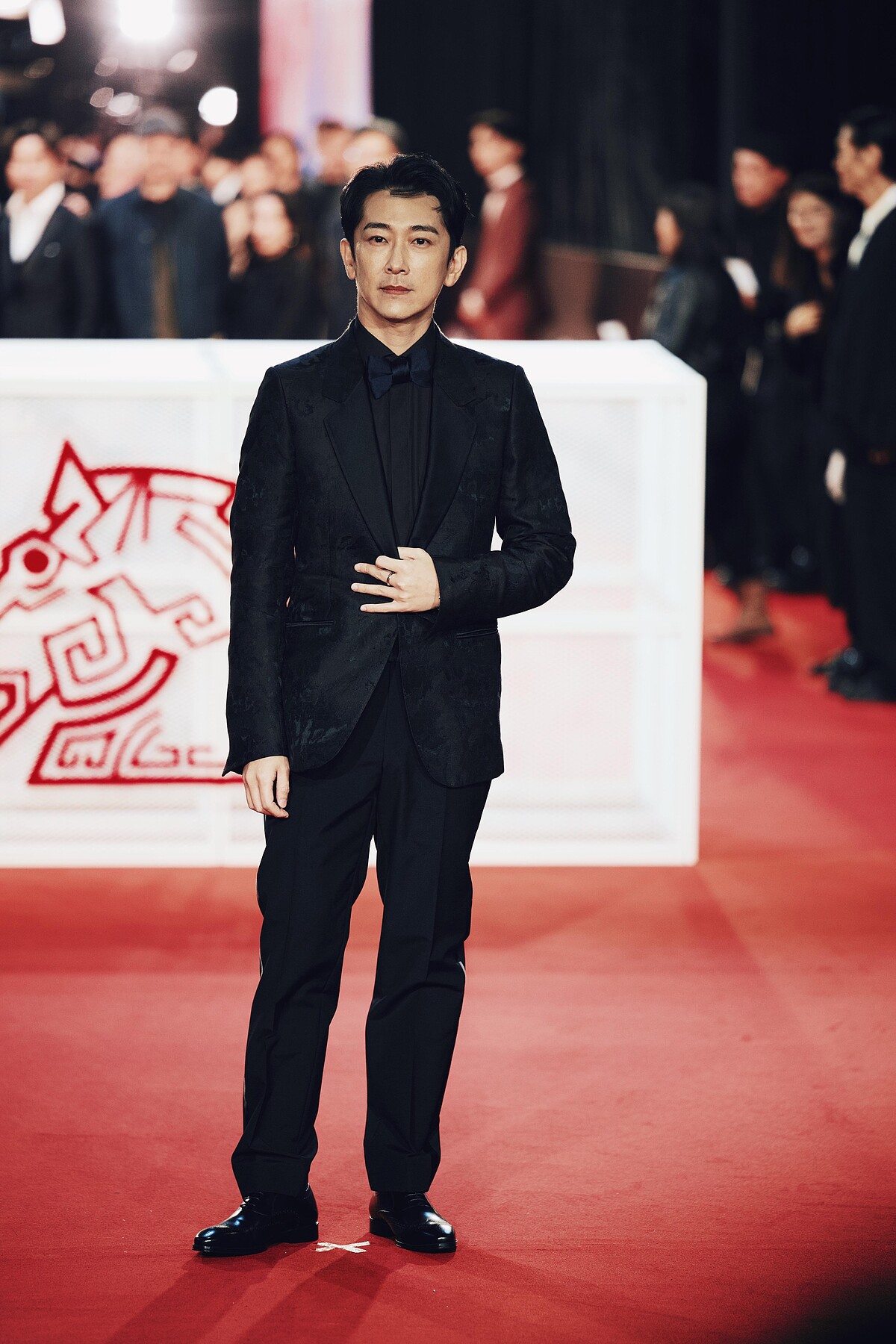 入圍本屆金馬「 最佳男配角」的演員莫子儀,再次穿著 APUJAN詹朴全套訂製款劍領西裝登場紅毯,搭配緞面翻領與印花領帶,內斂、神秘又優雅。