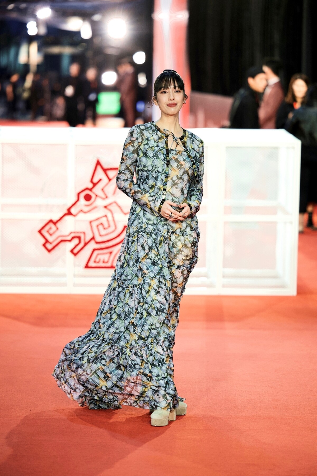 第一次接下紅毯主持棒的王渝萱,一襲香奈兒多彩印花亮片刺繡絲質雪紡長洋裝,搭配上香奈兒Comète Harmonie戒指、 Comète 1932 耳扣、Lune De CHANEL單邊耳環石以及 Coco Crush 單邊耳環、Lune De CHANEL戒指。
