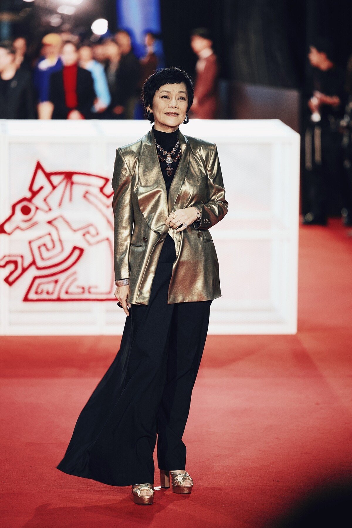 張艾嘉穿上金色西裝搭配寬褲一派從容,在紅毯上展現別樹一格的自在態度。