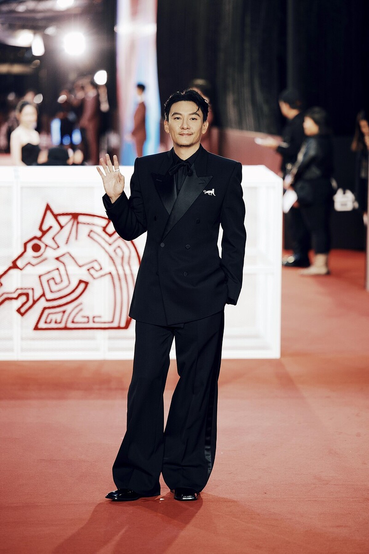以電影「角頭-大橋頭」演員之姿出席本屆金馬的懷秋,穿上 BALMAIN 2024 早秋系列白金單釦鑲飾迷宮緹花西裝套裝,剪裁合身的西裝外套有著經典的義大利風格翻領與法式肩部立裁設計,在一片黑色調男士正裝中讓人眼睛一亮,鞋款更呼應整體色調,大膽選擇褐色麂皮短靴,瀟灑中帶出獨特的個性風格。
