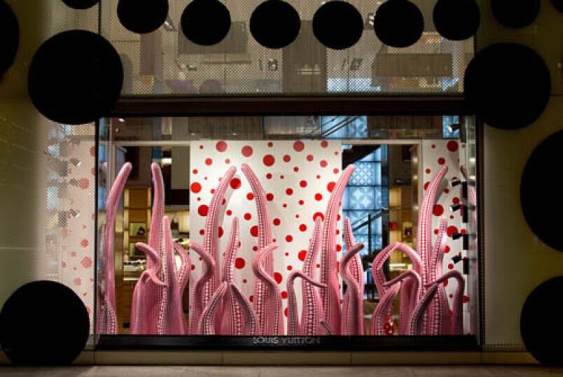 同期間位於紐約第五大道的路易威登旗艦店,也揭幕以草間彌生創作主題櫥窗與外牆,高齡83歲的草間彌生亦蒞臨現場參與這充滿奇想的盛會。對於這位藝術家而言,她看見她的生命是「一個迷失在百萬個點中的其中一點」,藉由這次的合作,她將她的圓點無限蔓延在世界各地,並且傳遞她的訊息:「愛到永遠」。