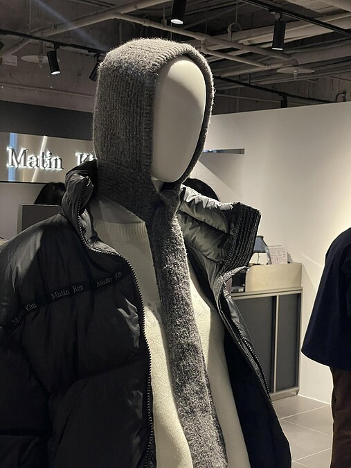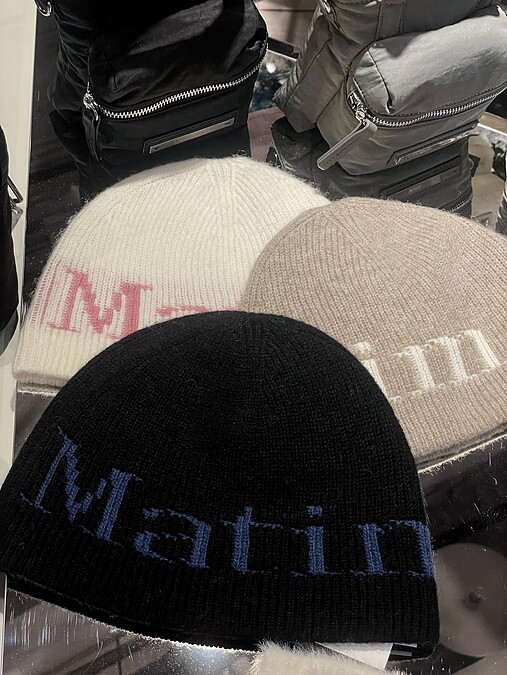 店中陳列了許多秋冬季節的保暖配件,其中毛帽就有多款可挑選,這款貼合頭型的彈性毛帽同樣運用了Matin Kim的Logo,是品牌相當熱賣的設計,白粉、駝白與黑籃的配色各自契合不同風格,不會過於厚重的面料也很適合台灣的冬天。