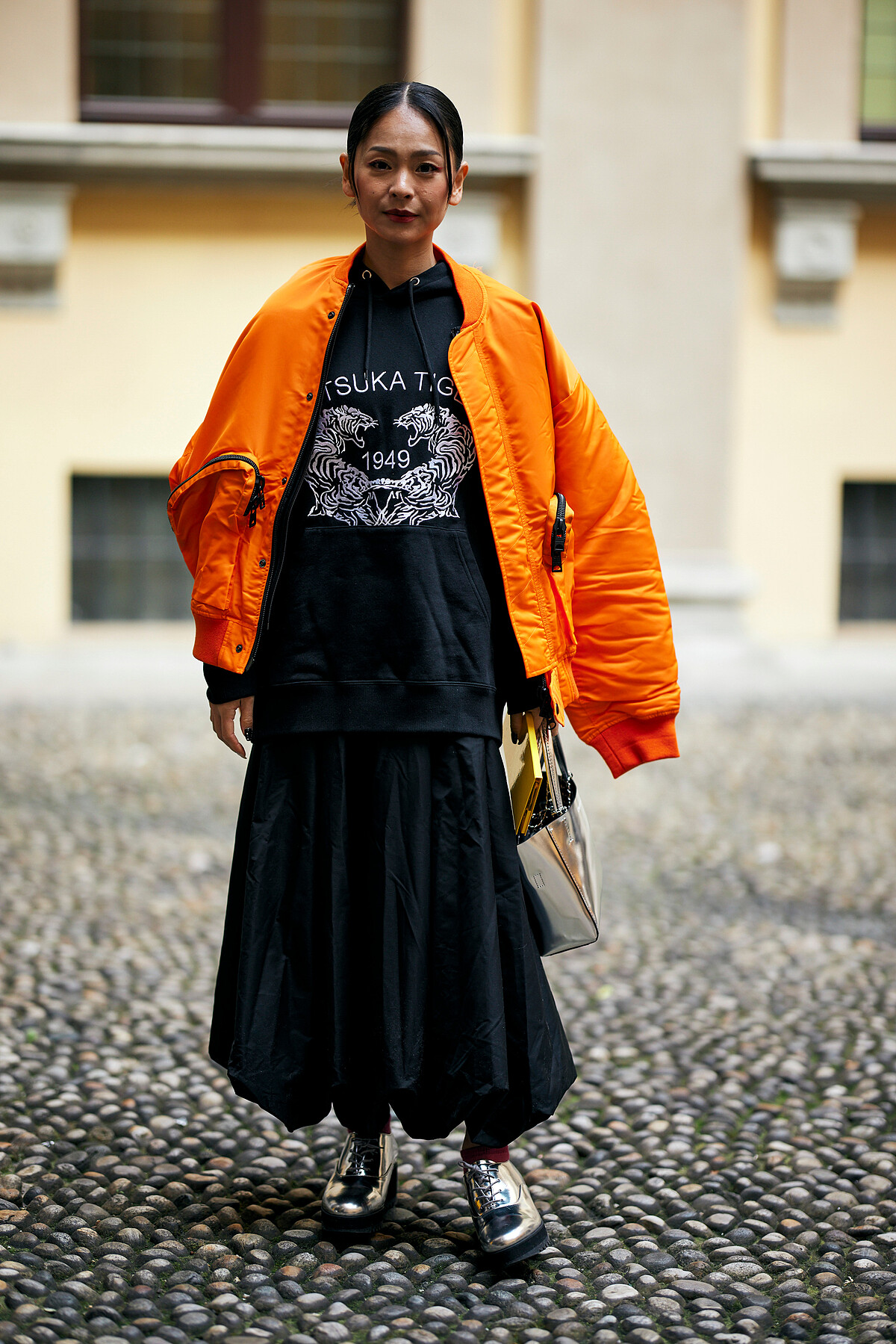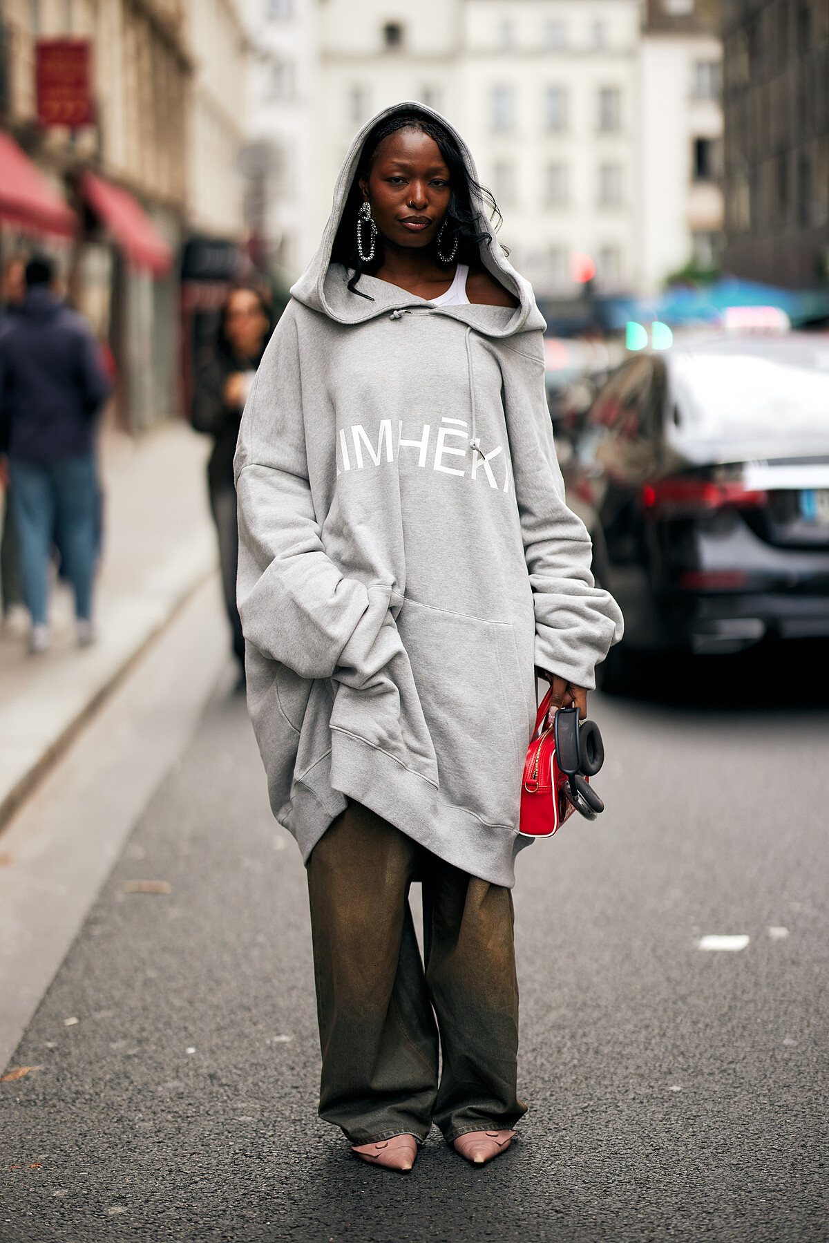 充滿街頭風的搭配,Oversize連帽上衣與運落地牛仔褲讓造型隨性又有街頭感,搭配上尖頭跟鞋增加時尚度。