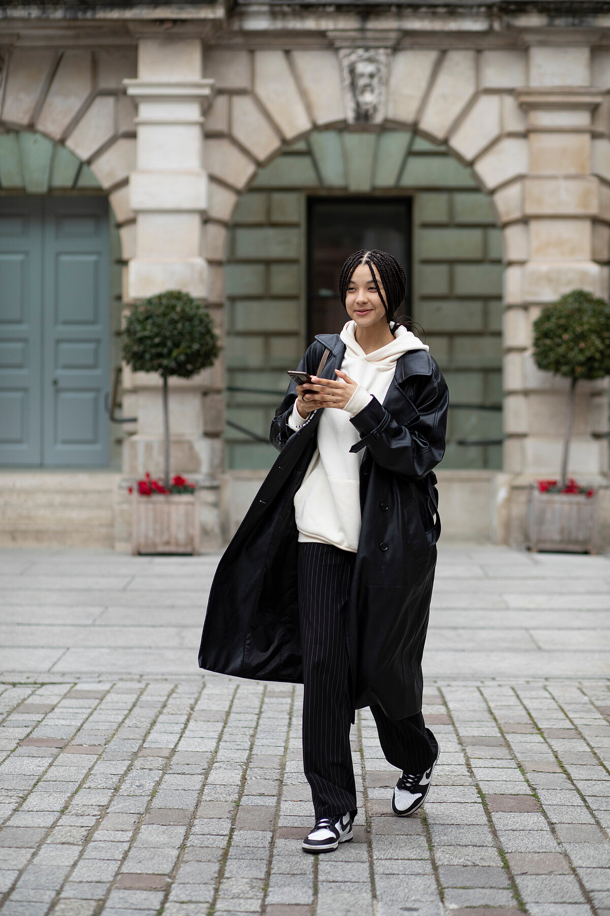 單品特點:連帽上衣搭配大衣是秋冬最流行的疊穿方式之一,能夠增添造型的層次感和正式感。
