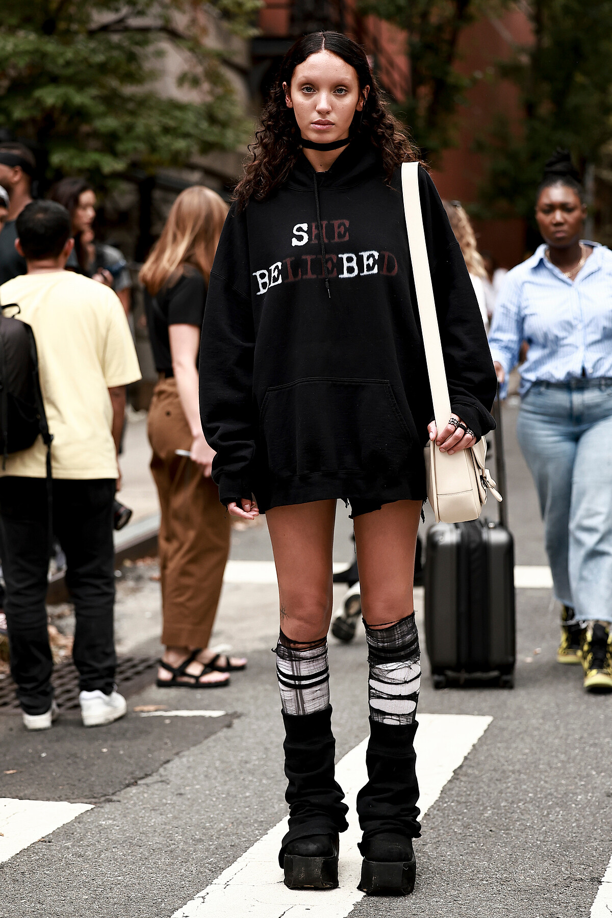 超寬連帽上衣搭配車褲營造出休閒運動風,高筒襪和項鍊點綴則增加了細節層次。