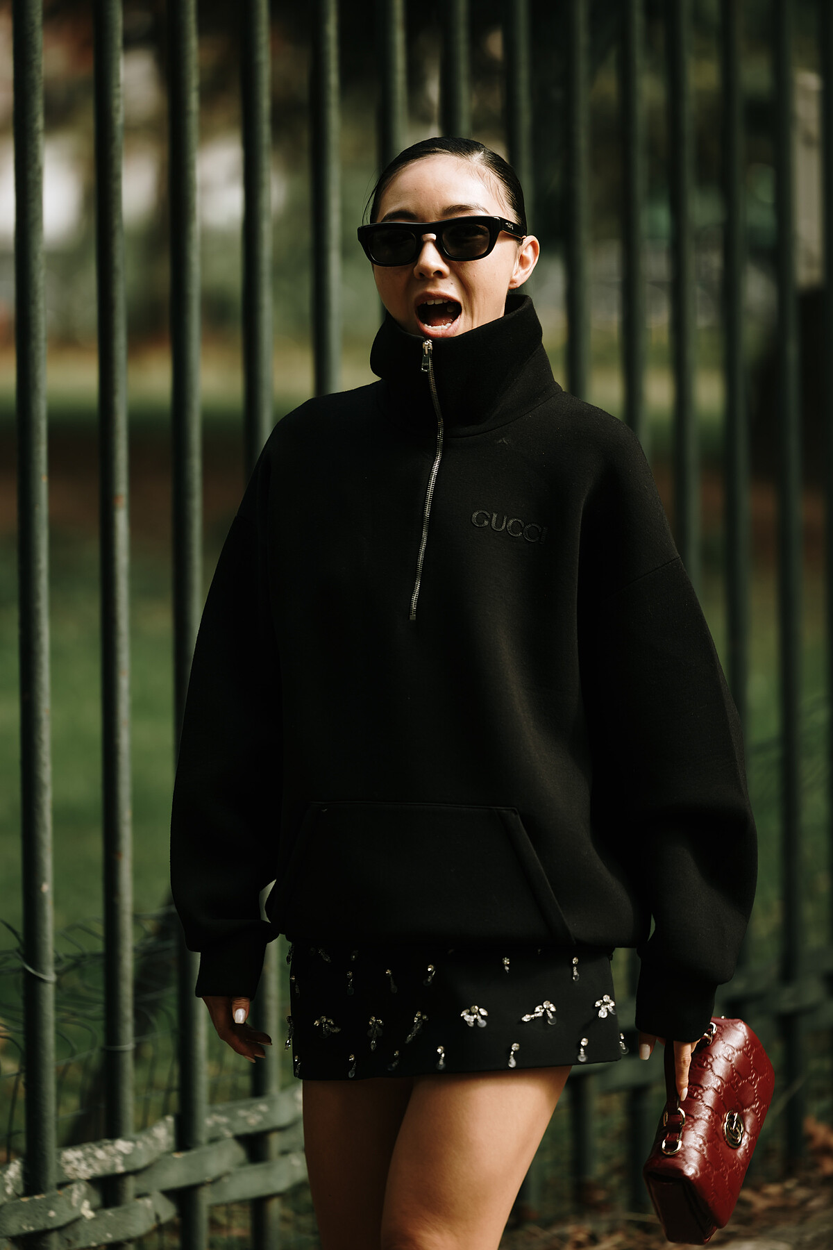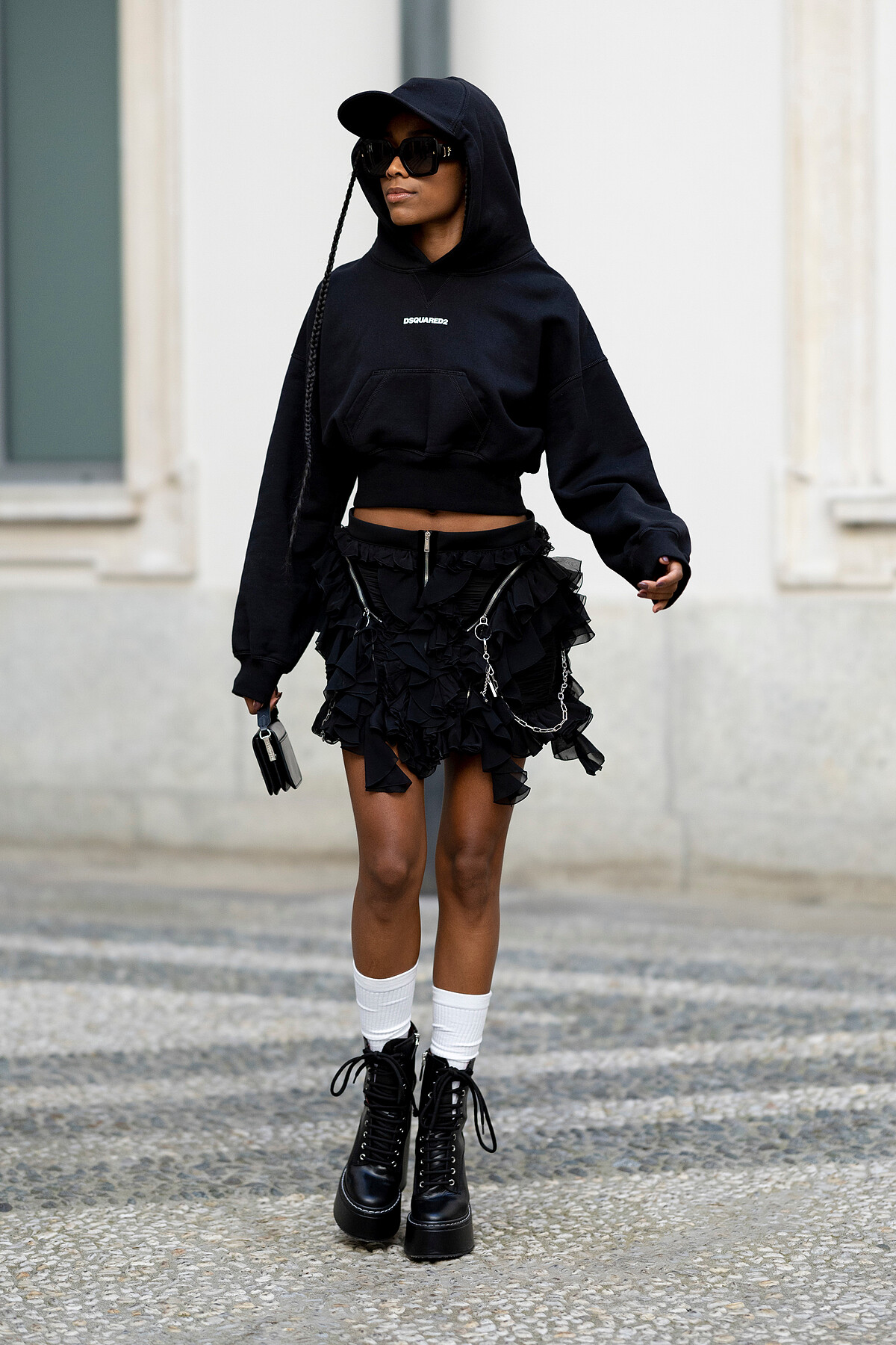 連帽上衣為重點搭配造型短裙與馬丁靴,讓造型有帥氣的前衛感,適合喜歡層次與細節的潮人穿搭。